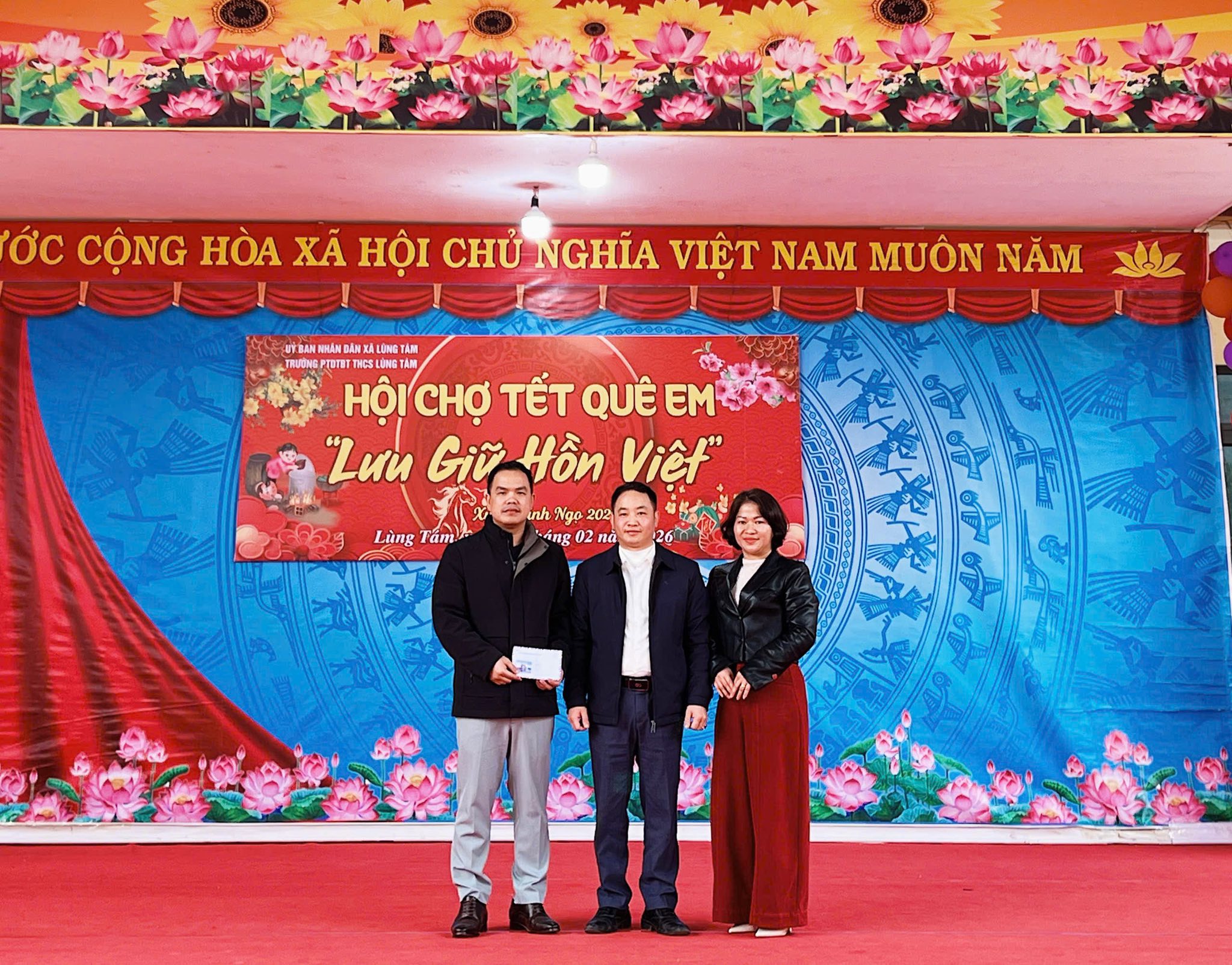 Đồng chí Mai Xuân Minh - Ủy viên BTV, Phó Chủ tịch UBND xã tặng quà động viên chương trình hội chợ của trường PTDTBT THCS Lùng Tám